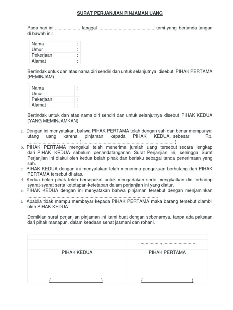 Surat perjanjian pinjaman uang pada hari ini jumat tanggal enam bulan januari tahun dua ribu tujuh belas kami yang bertanda tangan di bawah ini: Apakah pinjaman uang wajib dituangkan dalam bentuk tulisan? Pada bagian judul dituliskan surat pernyataan, kemudian diikuti dengan tanggal, nomor dan lampiran. Apa yang dibuat oleh peminjam uang? Siapa surat pernyataan yang digunakan untuk peminjaman uang?
